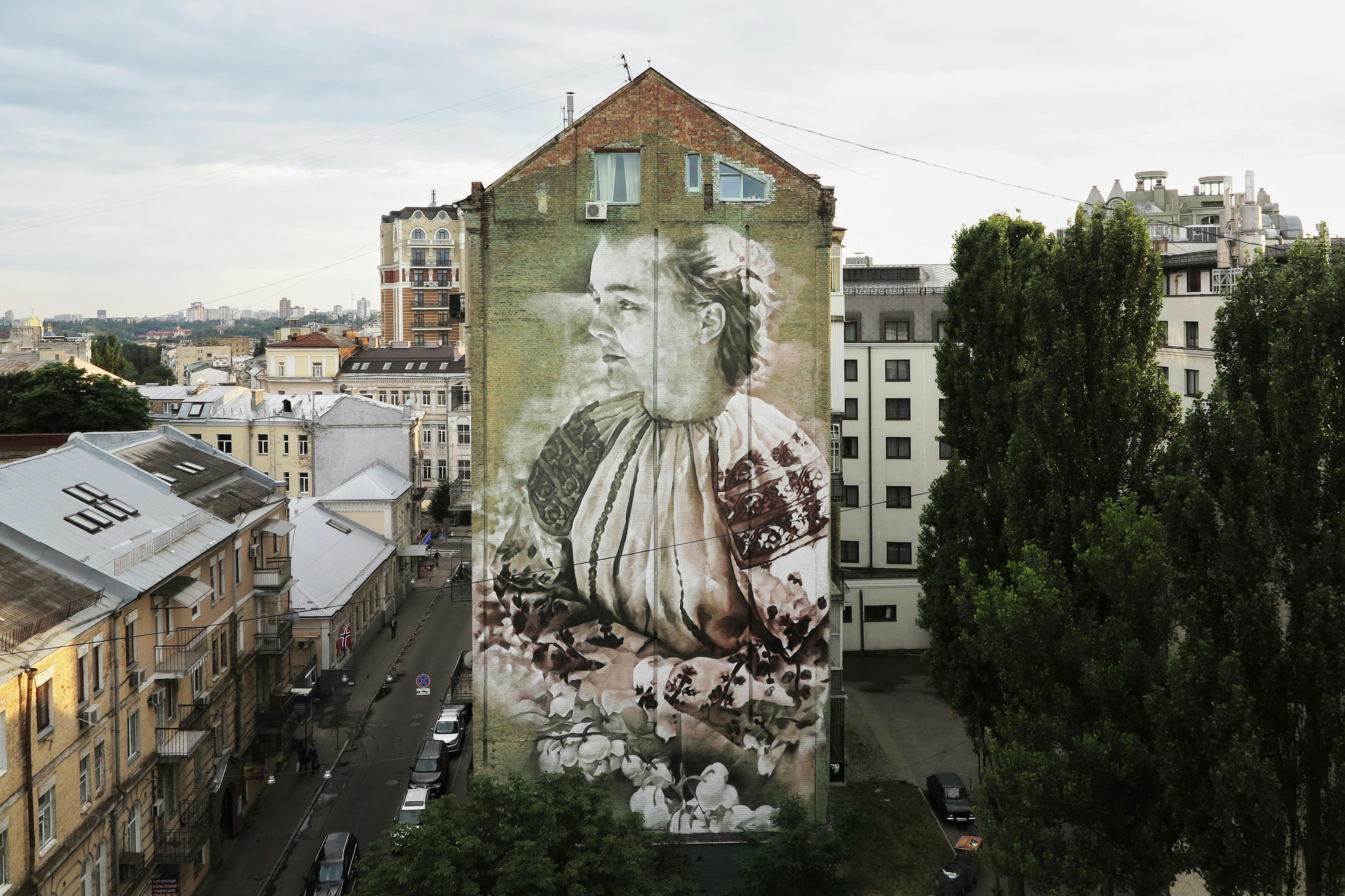 конвалія (Lily of the Valley) painted as part of CityArt project in Kiev, Ukraine. The title of this work comes from the first poem published by famous Ukrainian poet, Lesya Ukrainka. The image was inspired by archival imagery while researching images of the Ukrainian 'Vyshyvanka' national dress. As a result viewers found in the work a resonance in the memory of the famous writer, one of Ukrainian literature's foremost writers, best known for her poems and plays. She was also an active political, civil, and feminist activist.